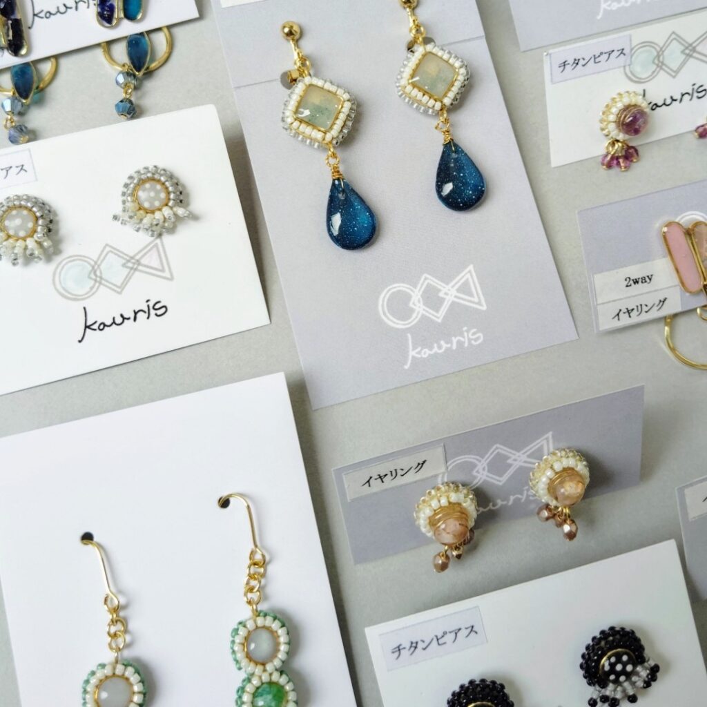 レジンを使ってひとつずつ作った人とはかぶらないオリジナルパーツのまわりに、繊細なビーズを縁取りしたアクセサリー。