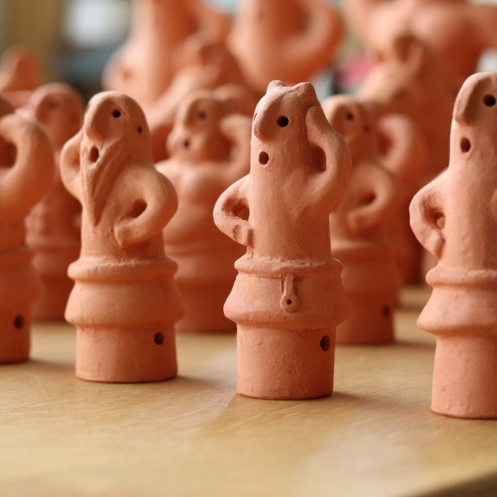 定番的な埴輪は踊る男・女や馬型埴輪、鶏形埴輪、円筒埴輪、家形埴輪などの既存の埴輪をもとに作陶したものになります。