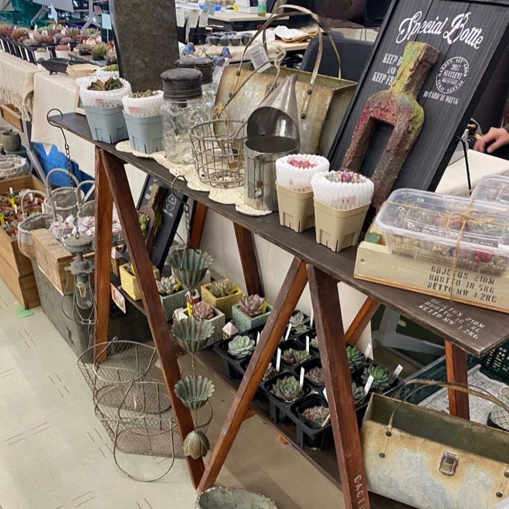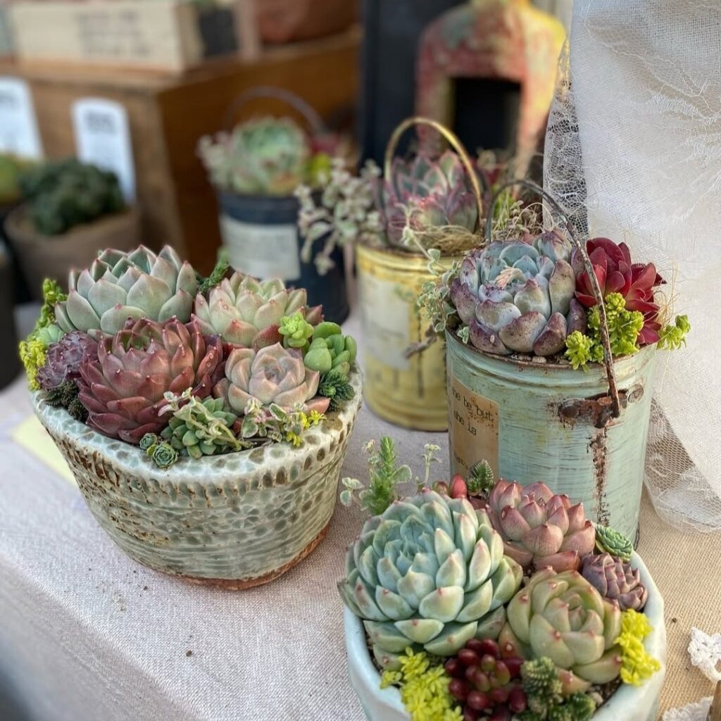 空き缶や廃材を利用して植木鉢を作っています。自作した鉢に多肉植物を寄せ植えしています。