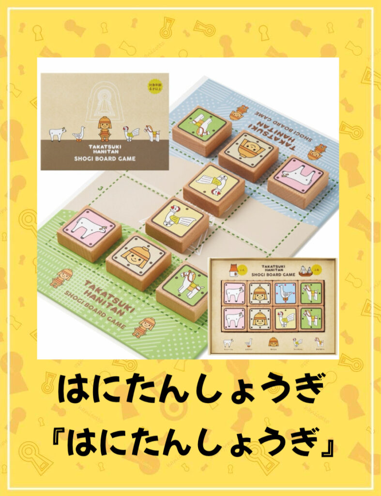 武人型ハニワ「はにたん」、牛型ハニワ「ウッシーくん」、馬型ハニワ「きゅうまくん」、鶏型ハニワ「コッコちゃん」、水鳥型ハニワ「ミズドリン」のキャラクターの駒を動かして「はにたん」を捕まえるシンプルながら将棋の基本が詰まったボードゲーム。