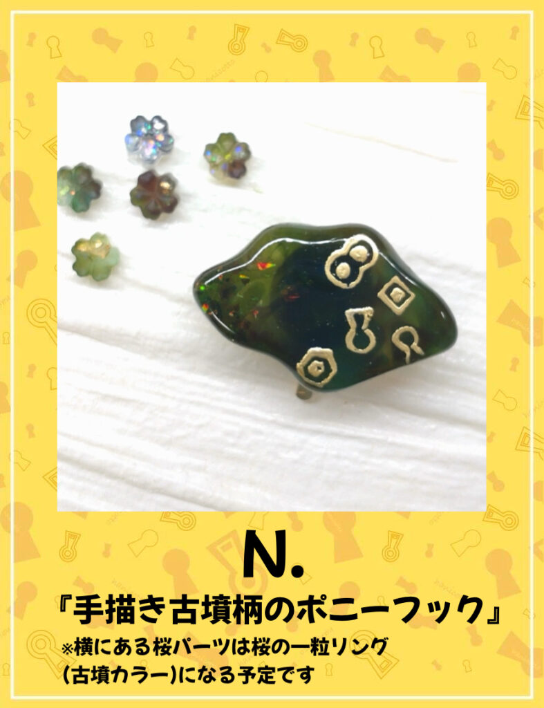 古墳作品は古墳の形を柄にしたアクセサリーを用意いたします。フリーハンドの古墳柄を箔押しで表した可愛いアクセサリーです。