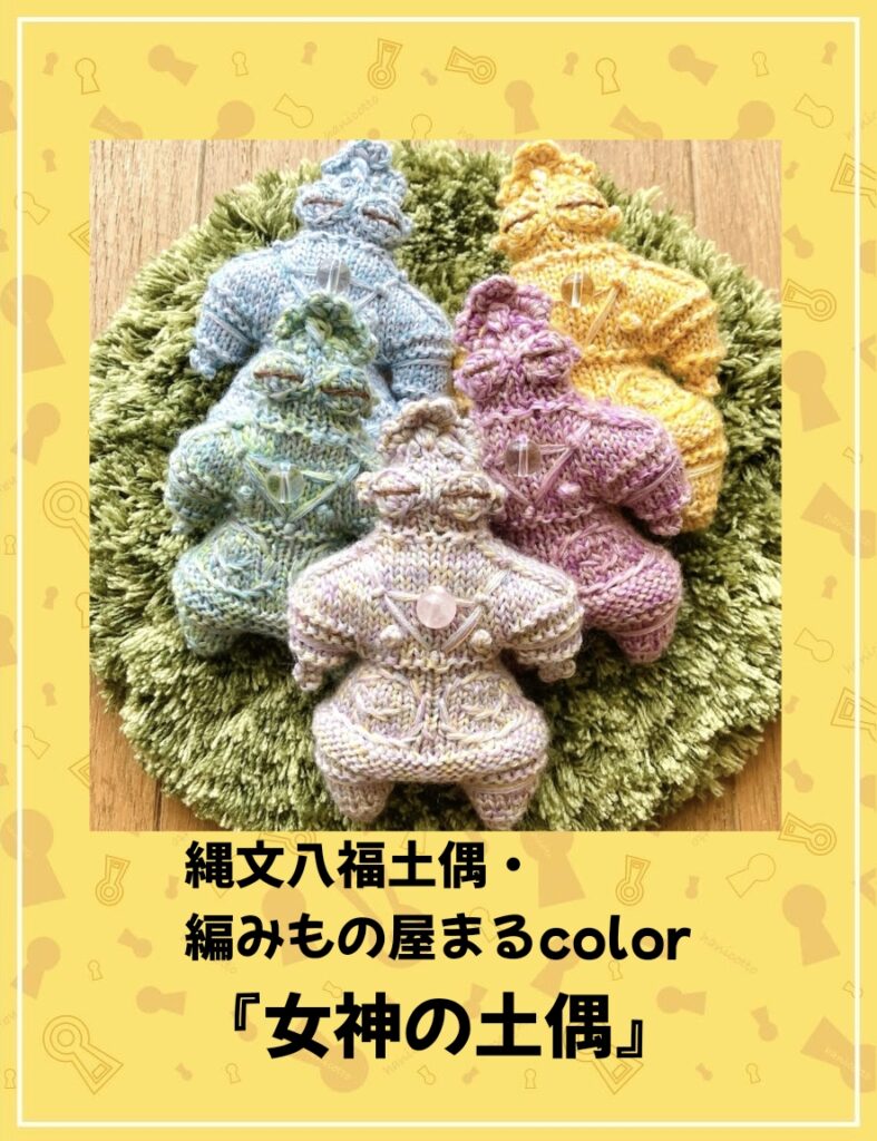 手のひらサイズのカラフルな手編みの土偶(女神の土偶)をはじめ、ビーナスの誕生をテーマにした和紙を使ったアクセサリー、シルクのレッグウォーマー、コースターなど日常をほっこり彩る手編み作品をご用意しています♪
