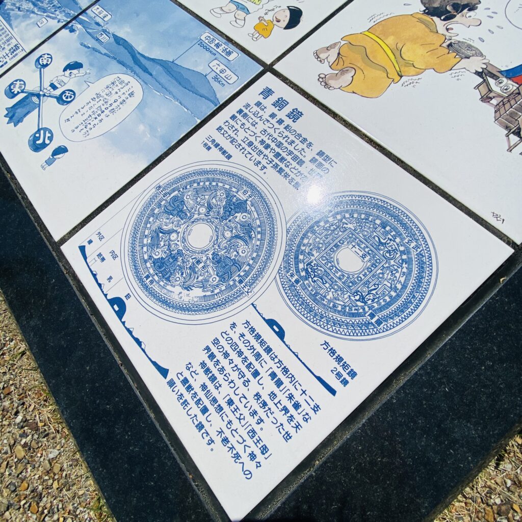 3世紀後半、邪馬台国の時代に築造されたと考えられ、中国・魏の年号「青龍三年(235)」銘鏡や三角縁神獣鏡(さんかくぶち–しんじゅうきょう)を含む青銅鏡5面、スカイブルーのガラス小玉1,600個余り、鉄刀・鉄斧などの貴重な遺物が出土しました。鏡は白銅色に輝き、鏡を包んだ麻布も残っていました。