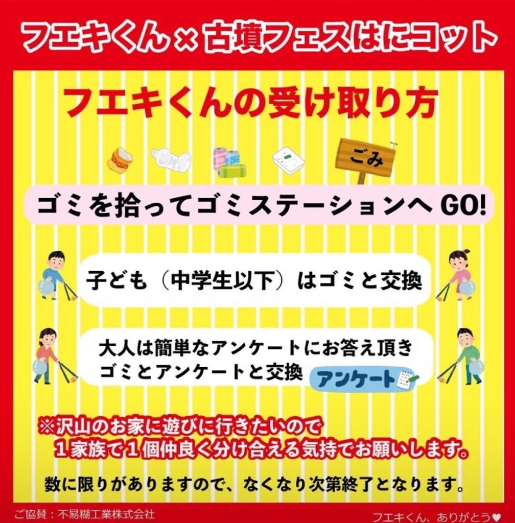 300名様(子供200名、大人100名)に古墳フェスバージョンフエキくんが貰えるよ(よく見ると手に埴輪握ってるの)
