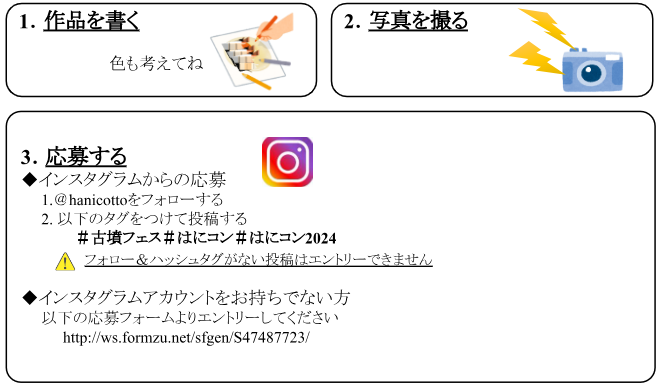 本ホームページおよび当日会場にて応募作品をご覧いただけます。 - 応募作品の中から最優秀賞 1 名、優秀賞 2 名を選出し、古墳フェスはにコット会場にて表彰式をおこないます!!