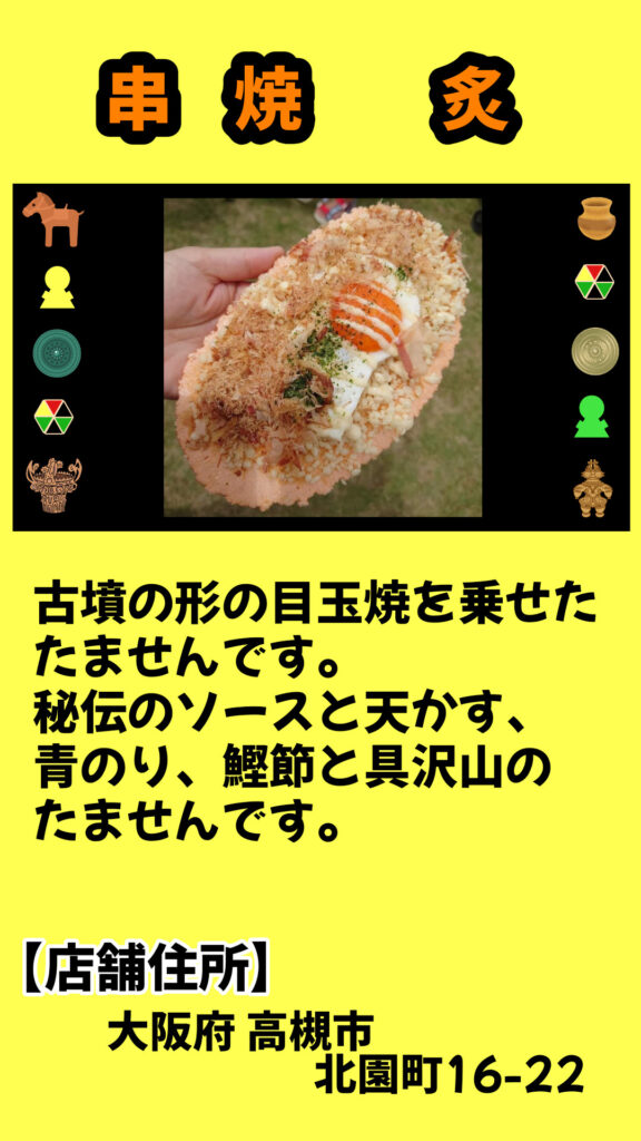 古墳フード串焼 炙 2025年10月6日 - by はにコット はにコット古墳フェスはにコットに関するページです。 毎年11月に今城塚古墳で古墳とアートのイベントを開催しています。 2025年vol.14 15回目の開催です。 来場者40,000人。(コロナ禍でもリモート開催で35,000人の来場者)
