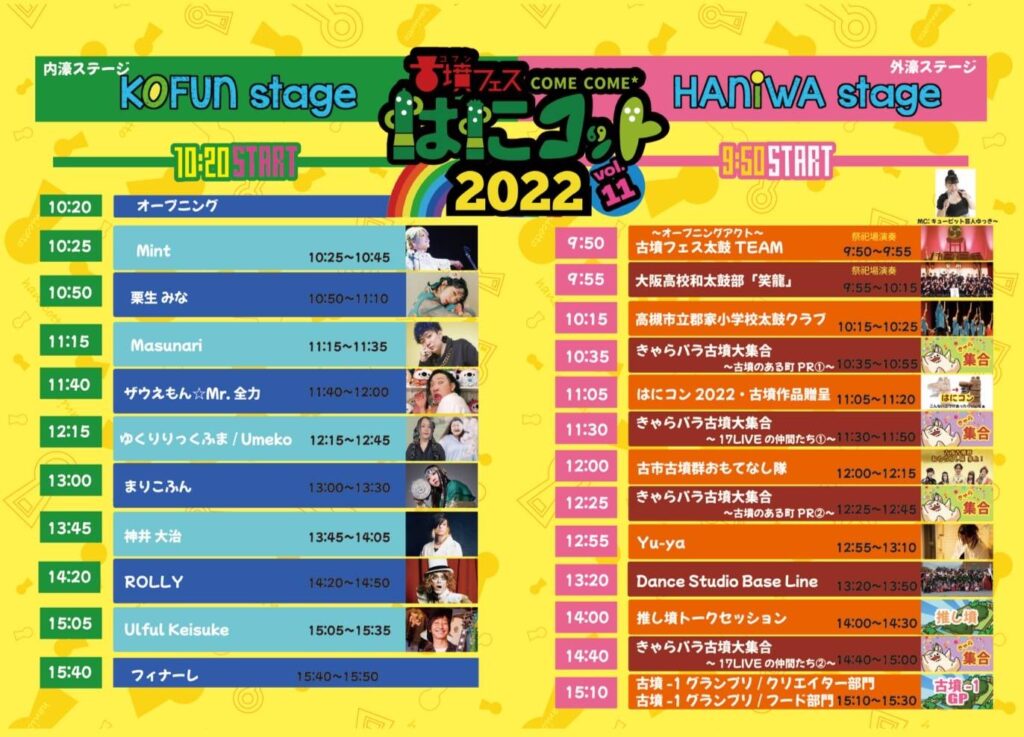 vol.11 / お知らせ\⚡️タイムテーブル発表のお知らせ⚡️/(修正版) 2022年11月16日2022年11月17日 - by ハゼ墳 いよいよ2週間足らずにせまった「古墳フェスはにコット2022 vol.11」 画像右側が「外濠 HANIWA STAGE」画像左側が「内濠 KOFUN STAGE」 となっております!! なんて豪華なラインナップ😍😍😍✨ 時間、場所ともにお間違えの無いようご注意ください!! それでは~~~!!Let’s enjoy MUSIC⚡️⚡️⚡️ ハゼ墳