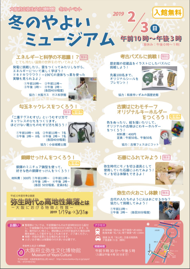 大阪府立弥生文化博物館は、2月3日(日)を入館無料とし、さまざまなワークショップを開催します!