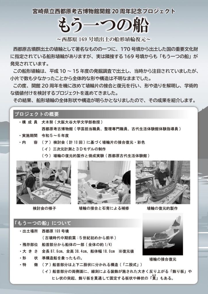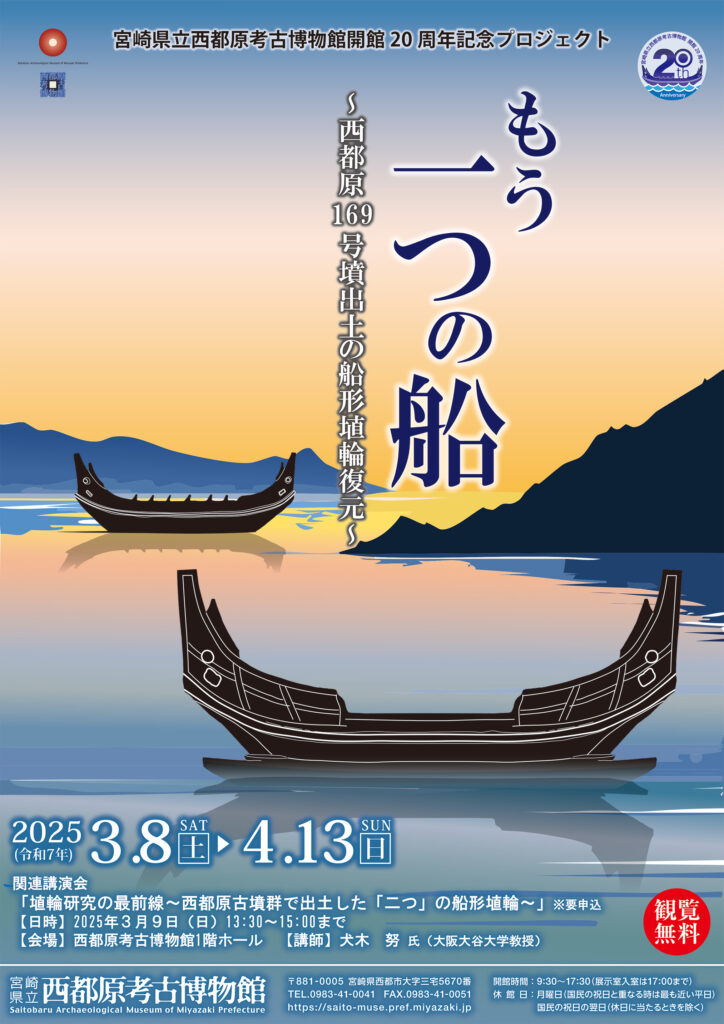 宮崎県立西都原考古博物館では、開館20周年記念プロジェクトで「もう一つの船~西都原169号墳出土の船形埴輪復元~」の成果が説明されます。