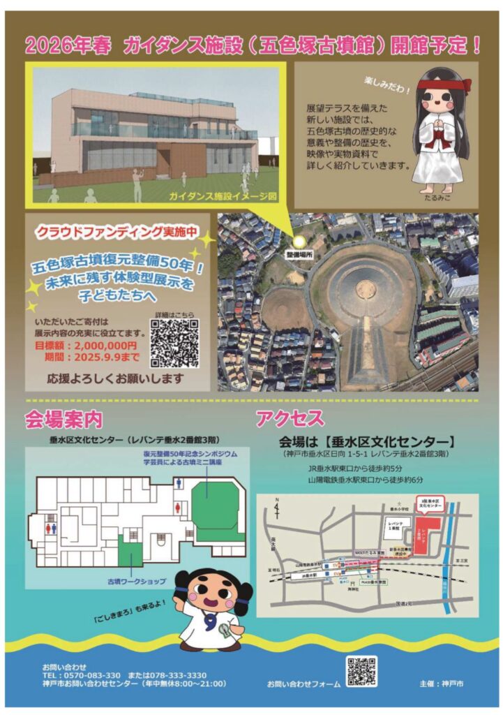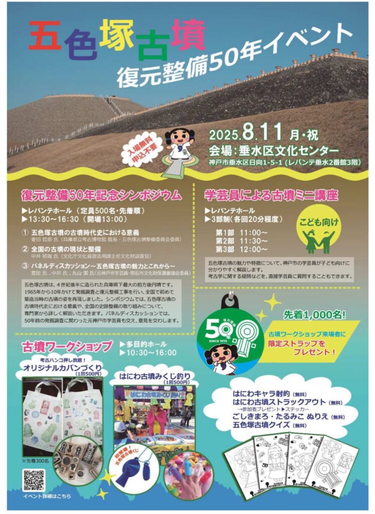 (2)会場 垂水区文化センター(レバンテホール、多目的ホール) ①復元整備50年記念シンポジウム・定員500名(先着順) ②学芸員による古墳ミニ講座 ③古墳ワークショップ •はにわ古墳みくじ釣り(1回500円) •考古ハンコ押し放題!オリジナルカバンづくり(1回500円) •はにわキャラ射的 •はにわ古墳ストラックアウト その他 マンホールカードの配布 山陽バス・ラッピングバスの運行 古墳フェスも全力で盛り上げに行かせていただきます!( • ̀ω•́ )ゞ みんな この日は五色塚古墳を愛でる日! ぜひ遊びに来てね!