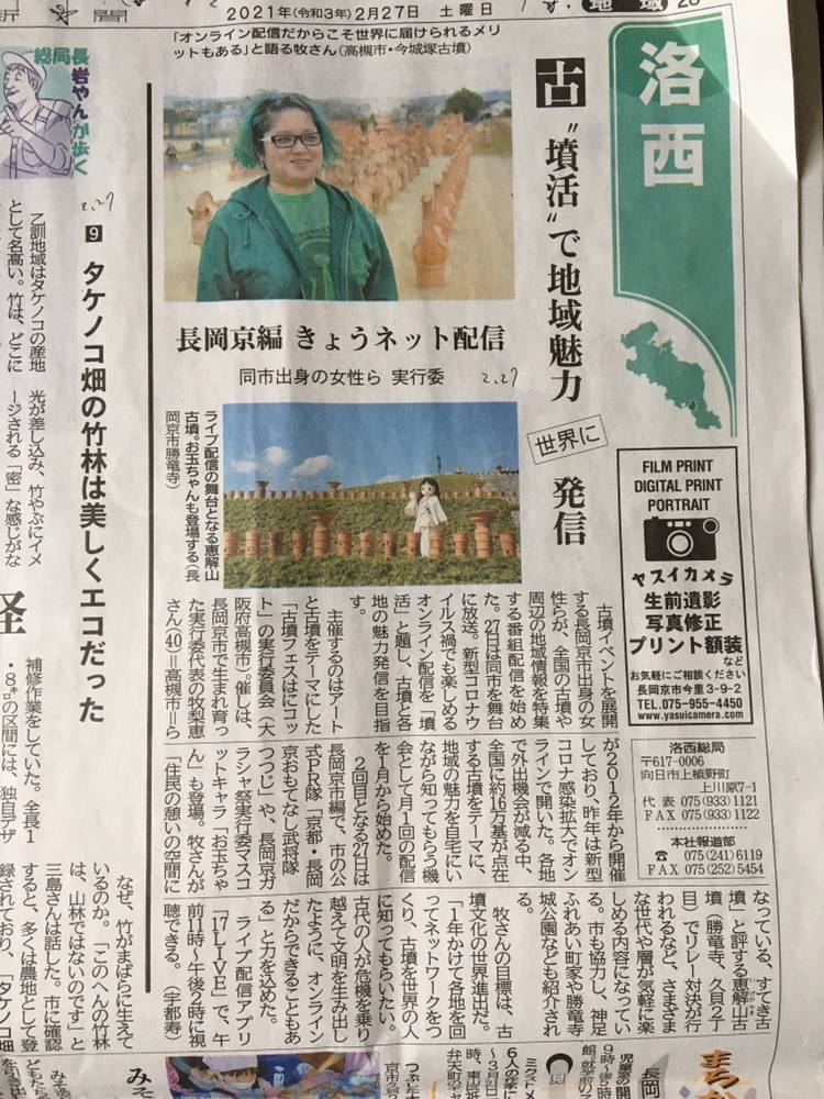 お知らせ / メディア京都新聞に古墳を発信する活動を取り上げていただきました 2021年3月17日2021年3月17日 - by はにコット 2021年2月27日(土)の朝刊「京都新聞」さんで昨日の17LIVE×古墳フェスはにコットの 「古 墳活で地域に魅力を”世界に”発信」の記事を書いてくださいました!! 活動を認知・理解していただき取り上げてもらって本当にうれしい限りです!!! はにコット古墳フェスはにコットに関するページです。 毎年11月に今城塚古墳で古墳とアートのイベントを開催しています。 2025年vol.14 15回目の開催です。 来場者40,000人。(コロナ禍でもリモート開催で35,000人の来場者)