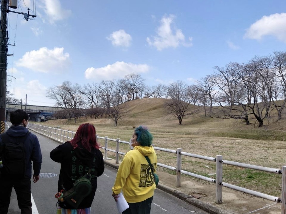 現在は、みんなが集う公園になっていますが、帆立貝型をしている古墳だよ。配信の時は、どこか高い場所から撮影されていたよ。「ホタテだよ~♪ホタテだよ~♪」よくわからない曲を歌うマキ墳。