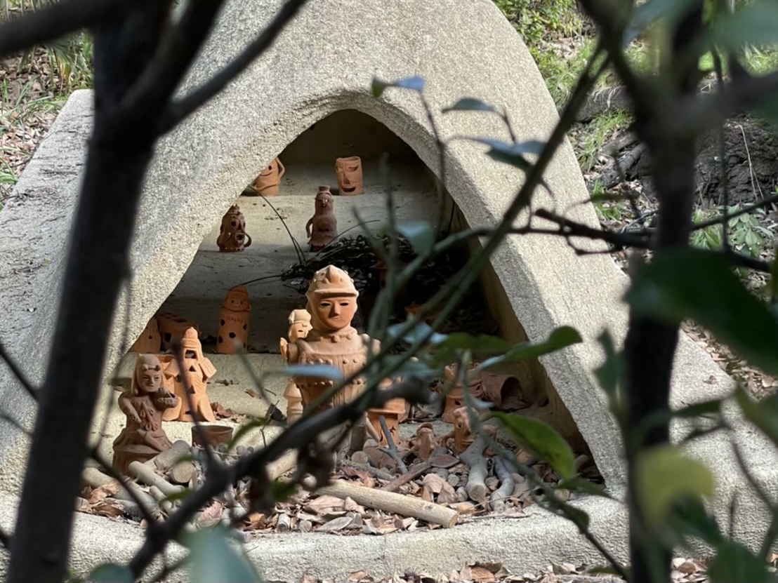 道明寺天満宮の登り窯。ここで埴輪を焼いていたのがプロ集団の「土師氏」。登り窯の中にかわいらしい埴輪が置かれていてそれを配信しているミカ墳。