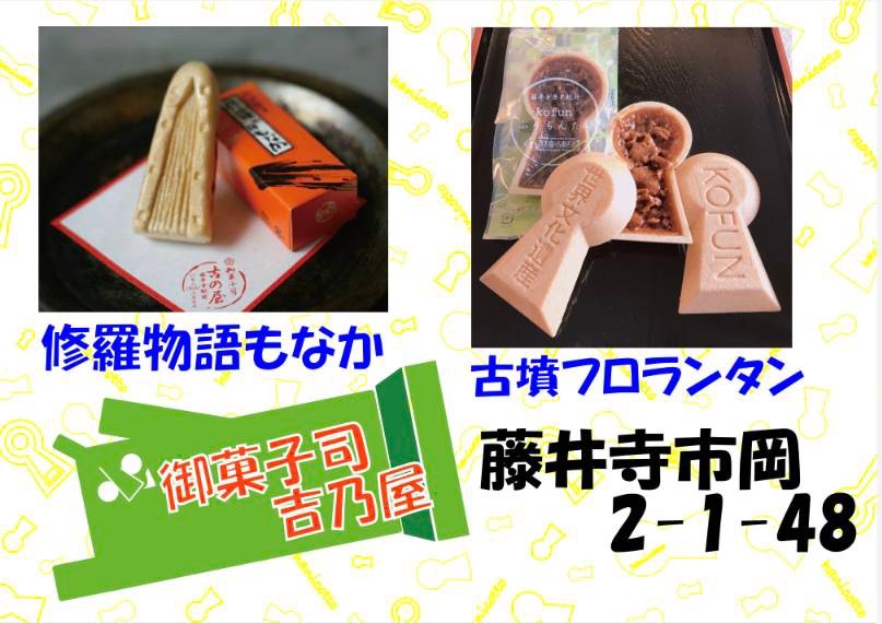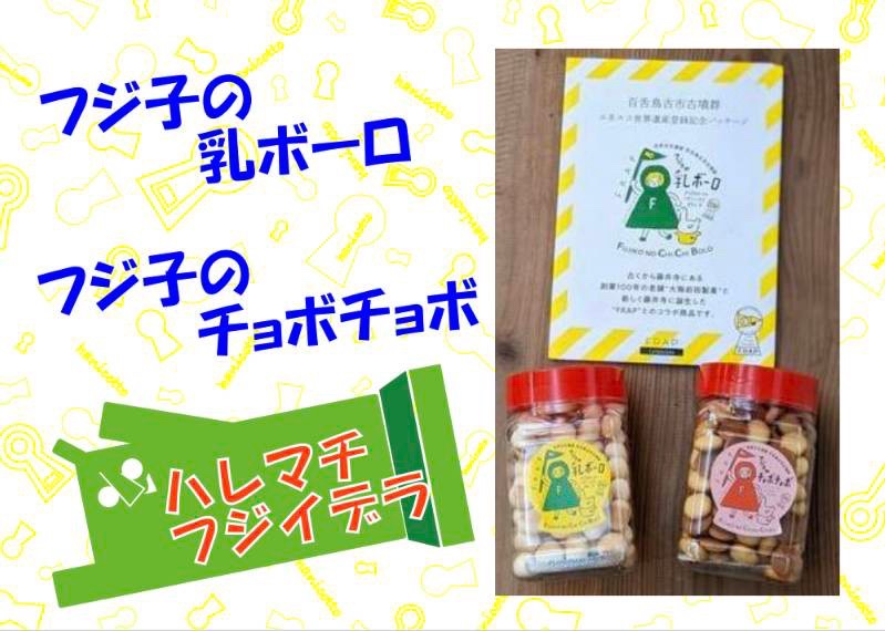 ハルワ食堂:土偶クッキー/CHAMETSUKE:古墳革雑貨/御菓子司 吉乃屋:修羅物語もなか/ハレマチフジイデラ:フジ子の乳ボーロ・フジ子のチョボチョボ