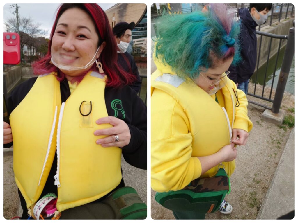 午後一は、水上に浮かばせて楽しむサップ。ため池は今回特別に許可をいただきました。救命胴衣二人ともパツパツやないかい!!!