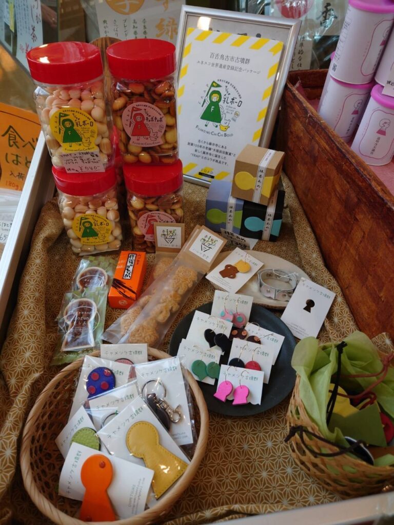 今回訪問時は残念ながらなかったのですが、通常は古墳あめがあるそうです。また、今回伺えなかった店舗さんお古墳グッズやフードのご紹介をさせてもらいました。